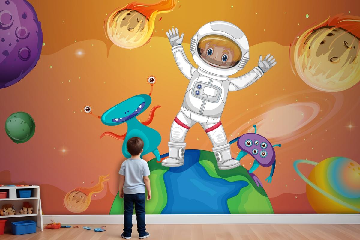Astronaut Kid With Aliens Standing On The Earth In Space Scene Wallpaper Mural