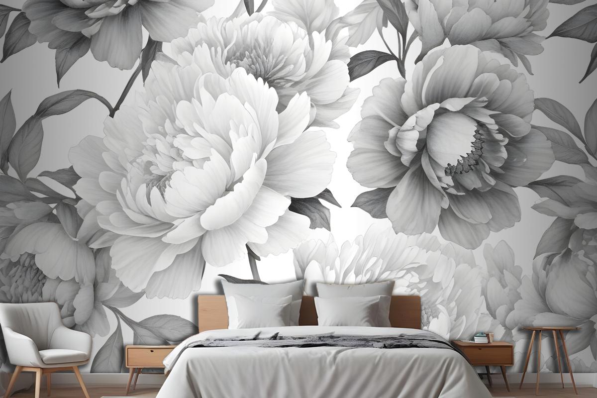 Black And White Floral Pattern With Large Lush Wallpaper Mural