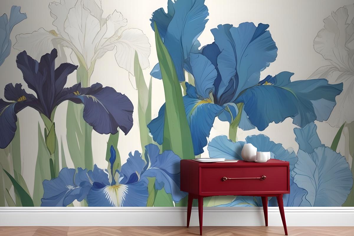 Blue And White Irises With Green Leaves Against A Light Wallpaper Mural