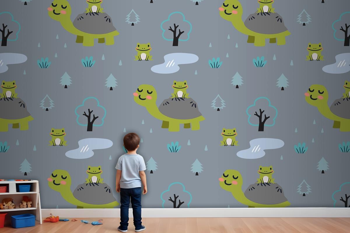 Cartoon Animals Pattern With Cute Mom Turtle And Frogs Wallpaper Mural