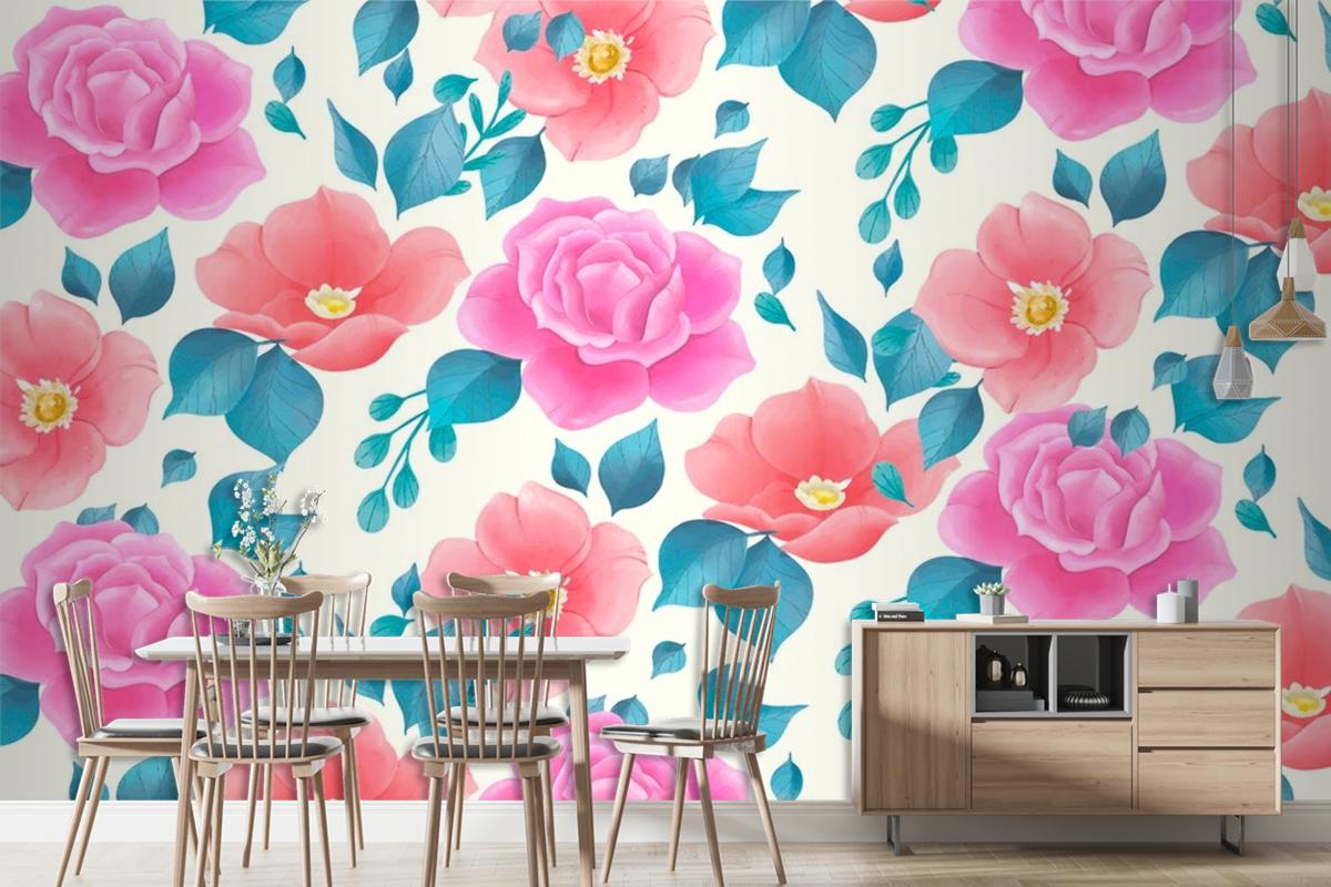 Cute Watercolor Floral Pattern With Rose Flowers Wallpaper Mural