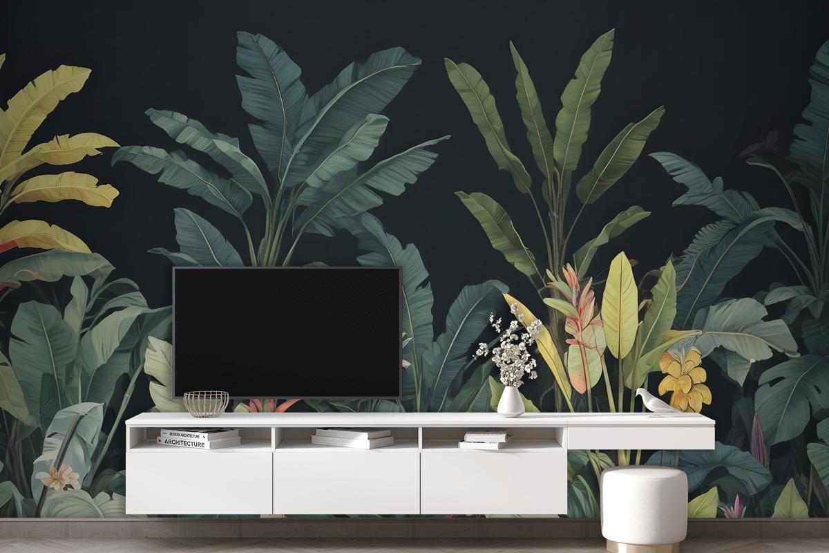 Dark Background Large Green Leaves Banana Plants Colorful Flowers Wallpaper Mural