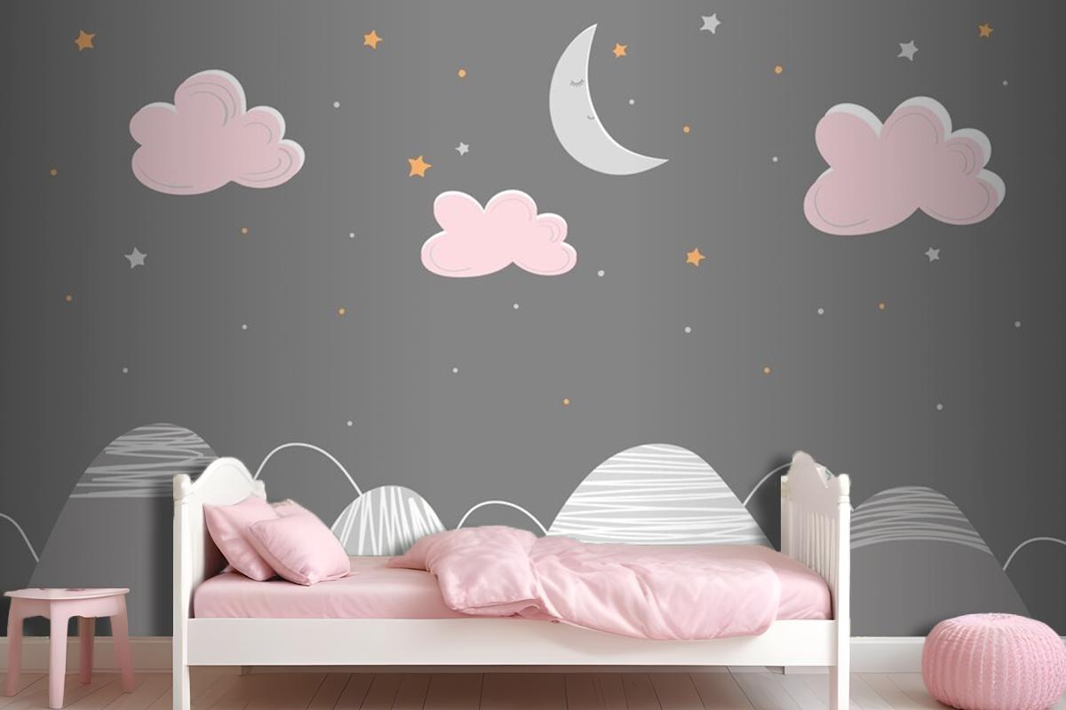 Decor In Scandinavian Style With Mountain Landscape Clouds And Sleeping Moon Wallpaper Mural