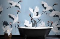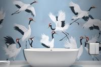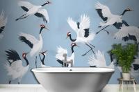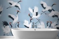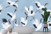 Flying Japanese Cranes Blue Painted Wallpaper Mural