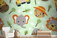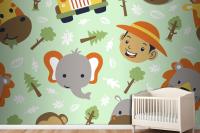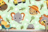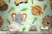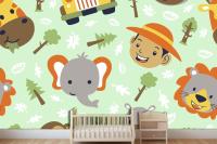 Funny Safari Animals Head Cartoon With Little Boy Head On Seamless Pattern Wallpaper Mural