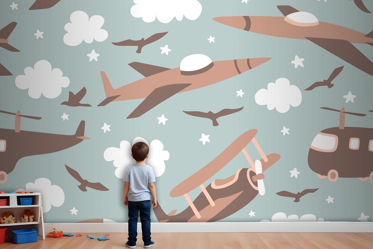Hipster Doodles Colorful Seamless Pattern With Plane Drawing Boy Wallpaper Mural