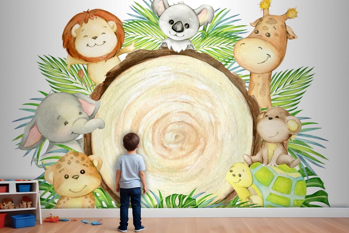 Leopard Monkey Koala Lion Turtle Elephant Giraffe Lettering One Tropical Animals Wallpaper Mural