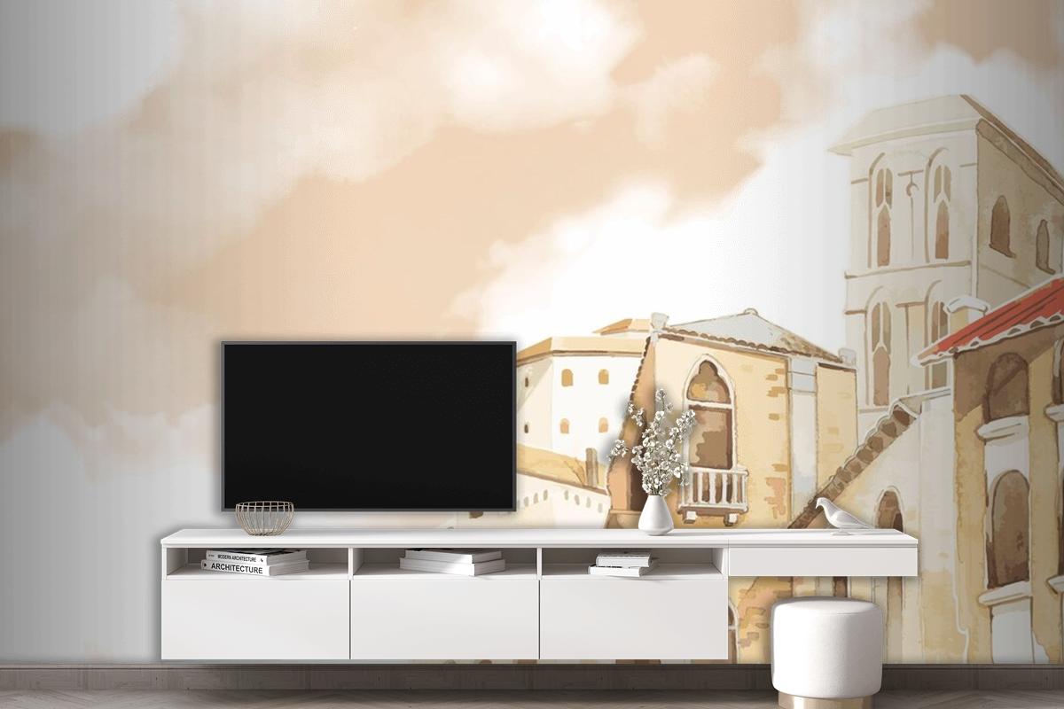 Mediterranean City Building Exterior Water Color Style Living Room Wallpaper Mural