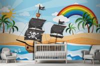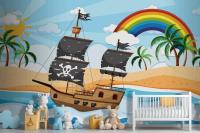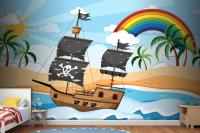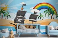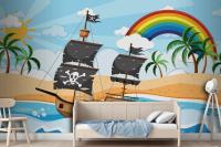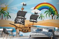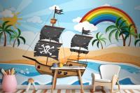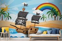 Ocean With Pirate Ship At Day Time Scene In Cartoon Style Wallpaper Mural