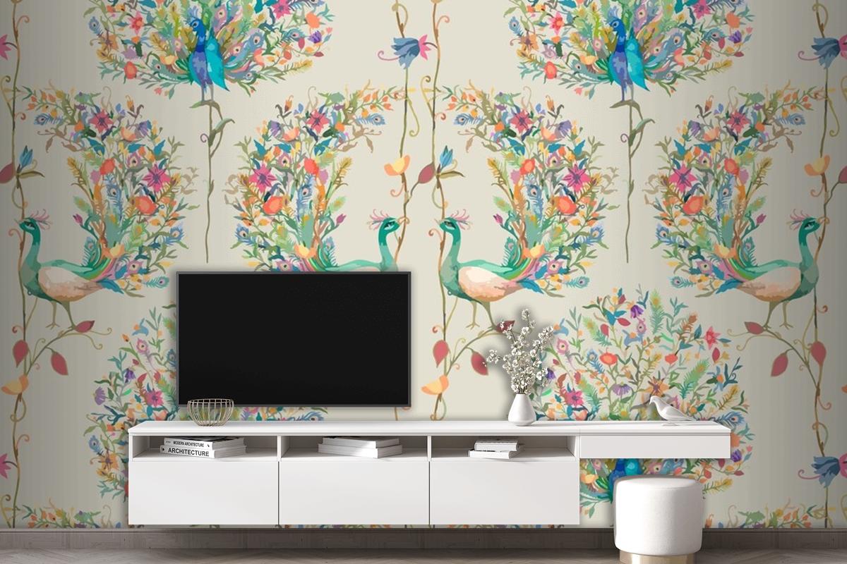 Pattern Background With Watercolor Peacock And Flower Living Room Wallpaper Mural