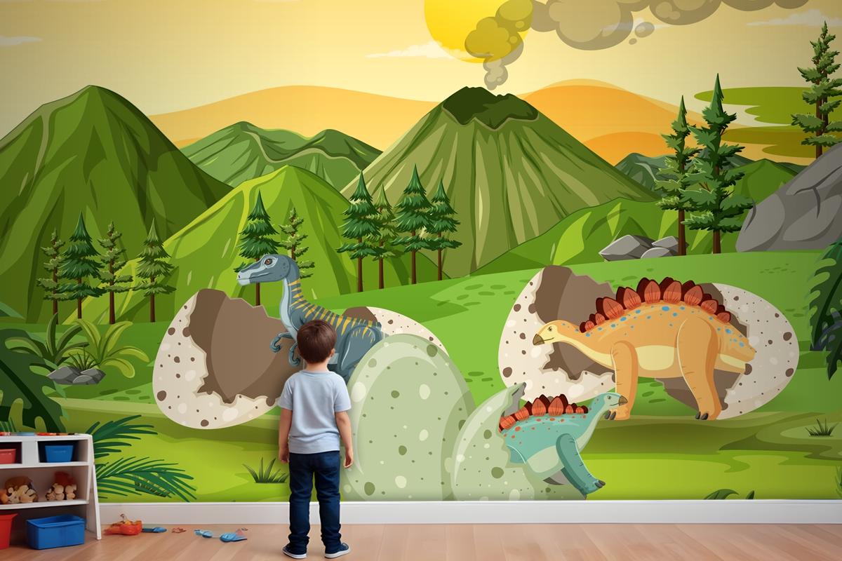 Prehistoric Forest With Dinosaur Cartoon Kids Wallpaper Mural