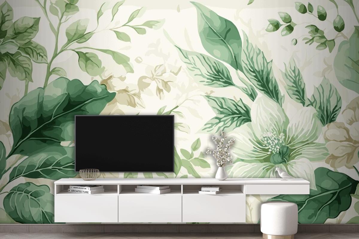 Seamless Watercolor Green And Beige Floral Pattern Living Room Wallpaper Mural