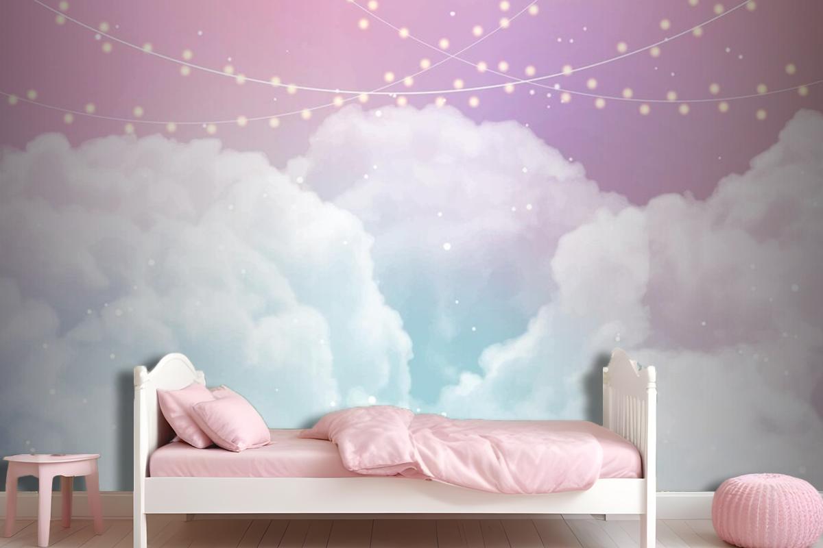 Sky Background With Sugar Cotton Candy Clouds And Stars Design Wallpaper Mural