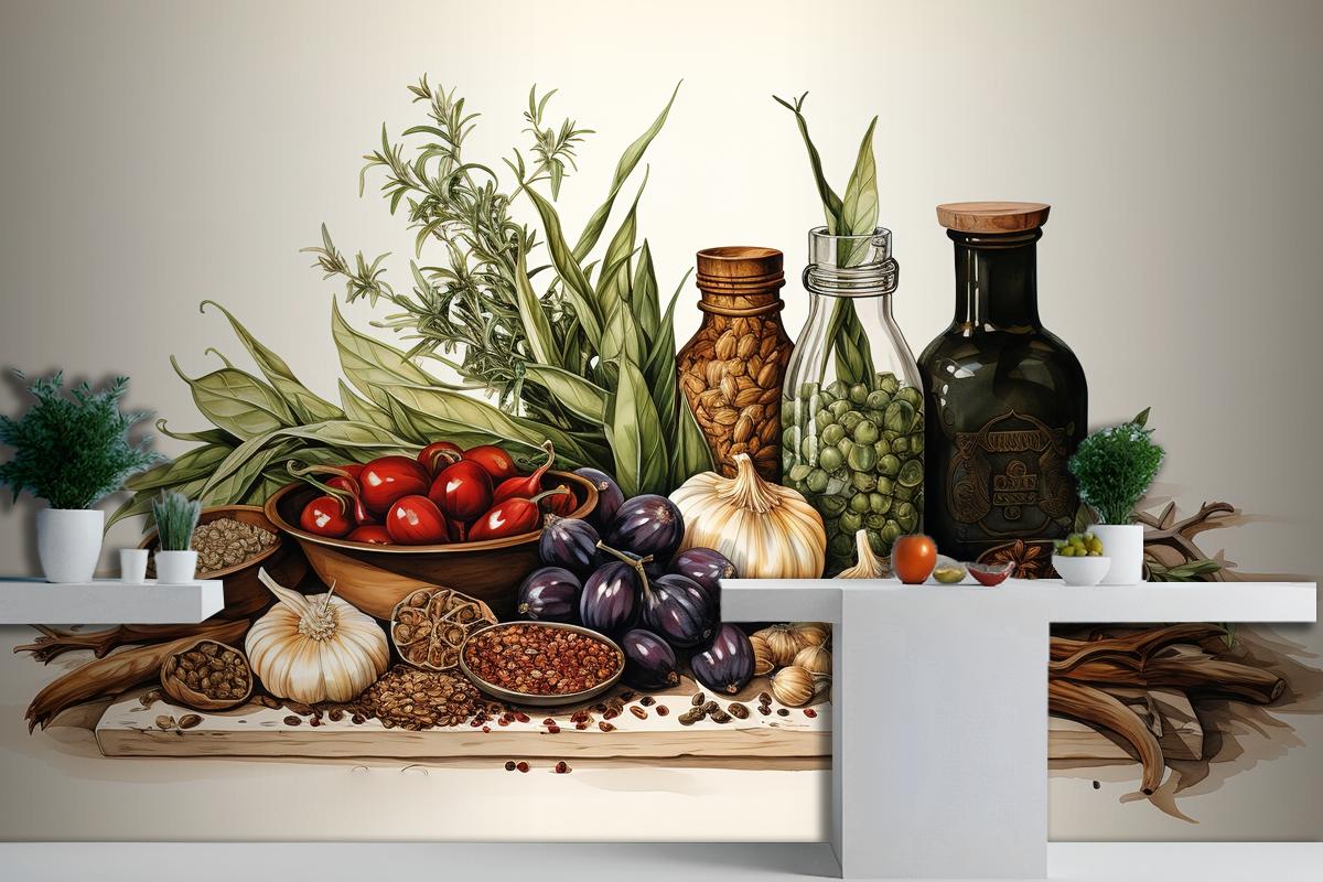 Spices And Herbs On Table Food And Cuisine Ingredients On Table Wallpaper Mural