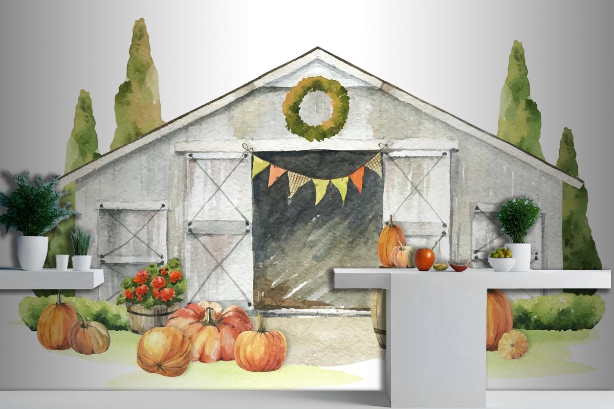 Watercolor Autumn Wooden Barn Pumpkin Harvest Wallpaper Mural