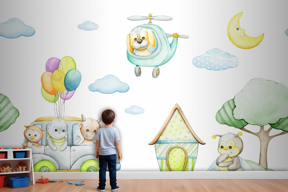 Watercolor Seamless Pattern In Cartoon Style Tropical Animals Car Helicopter Moon Wallpaper Mural
