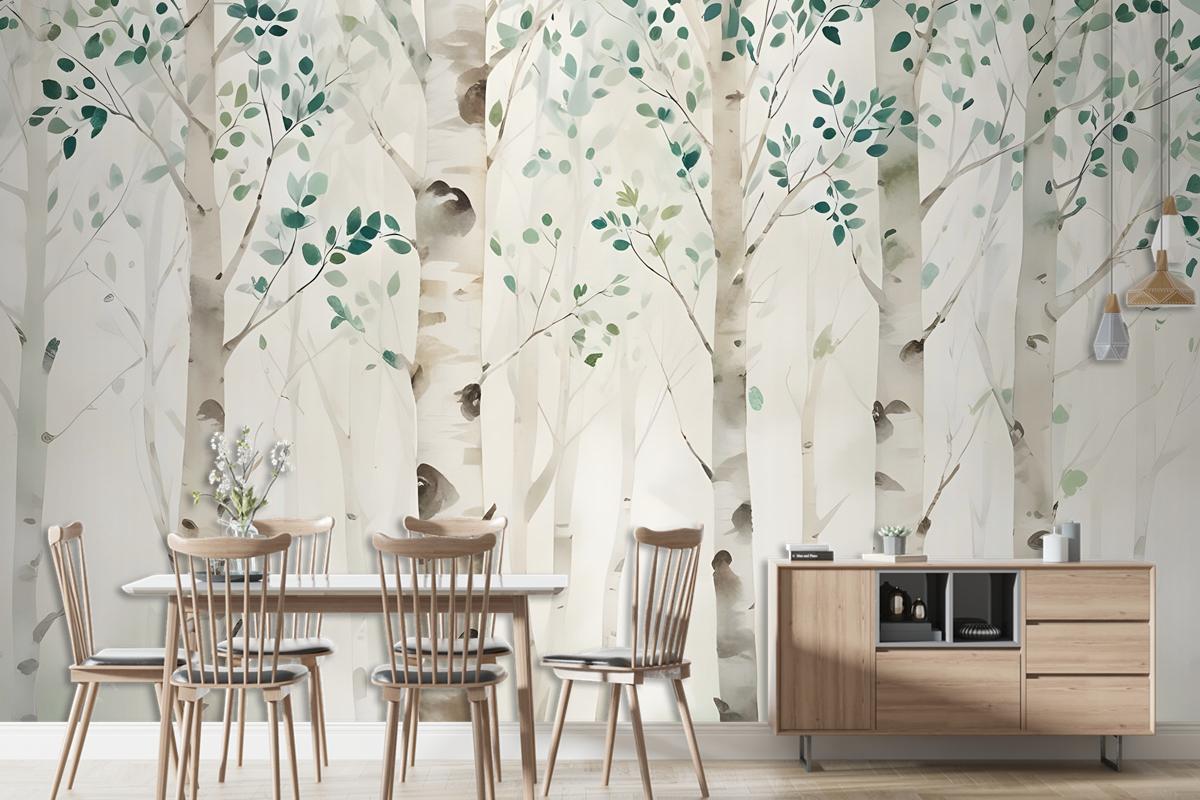 Watercolor Style Forest With Green Brown Little Leaves Wallpaper Mural