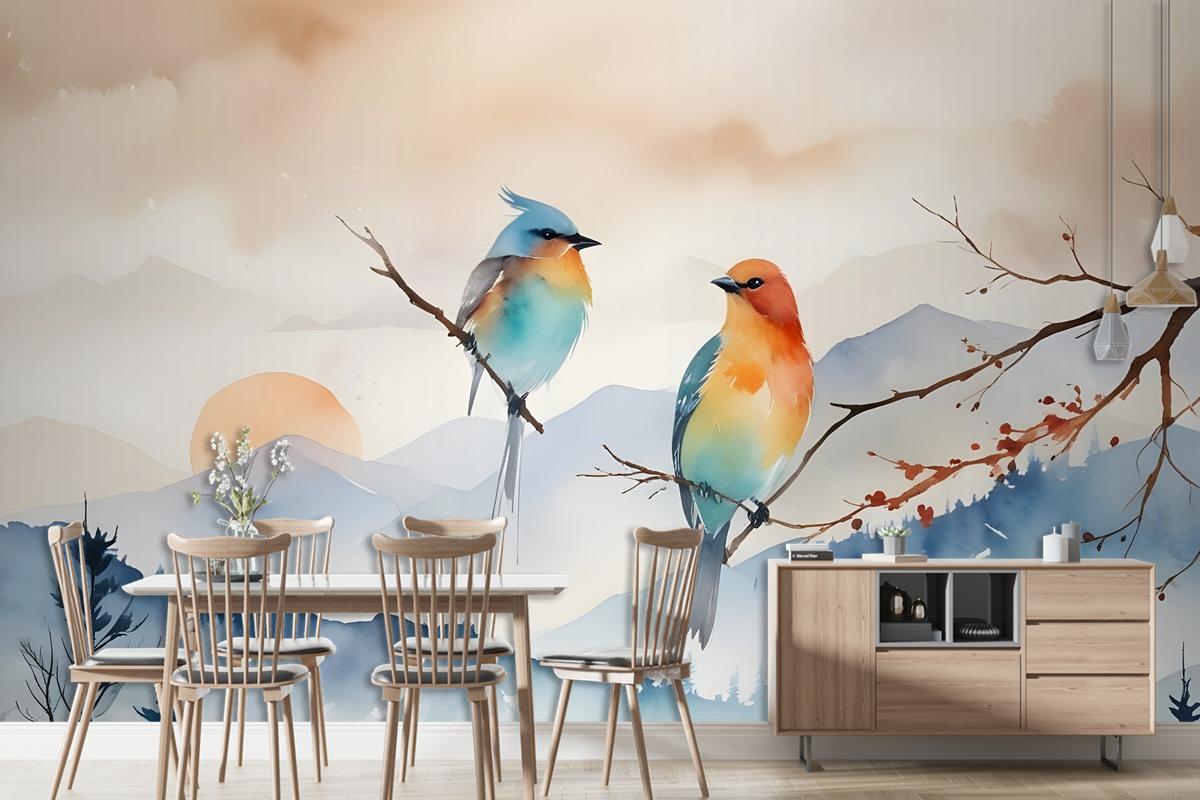 Watercolor Winter Landscape And Colorful Bird Wallpaper Mural